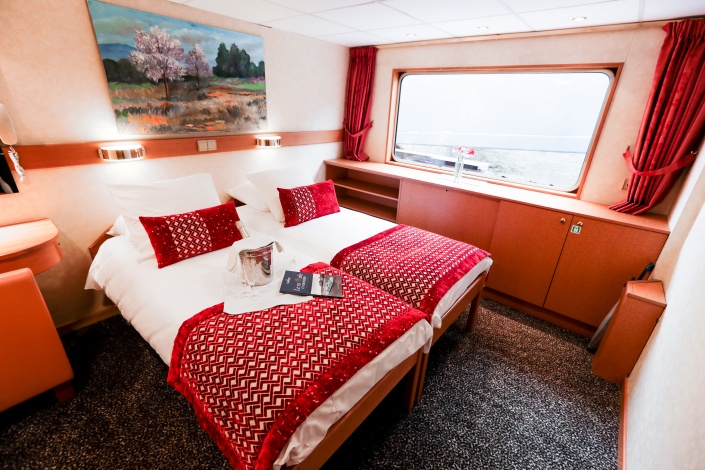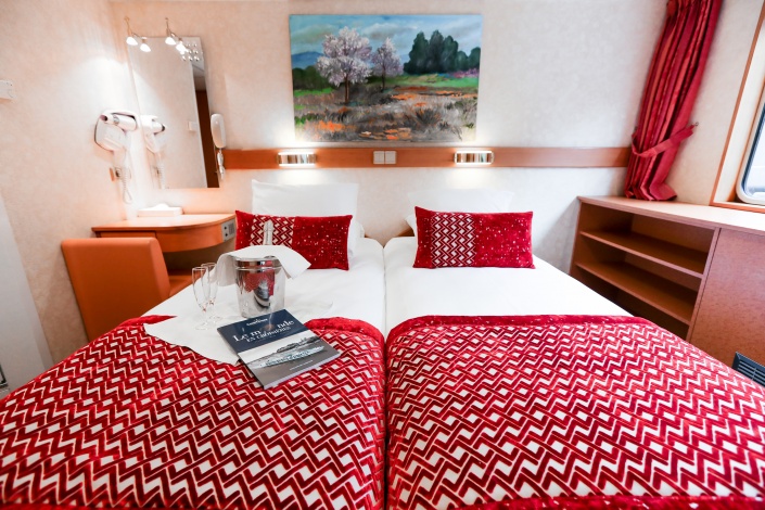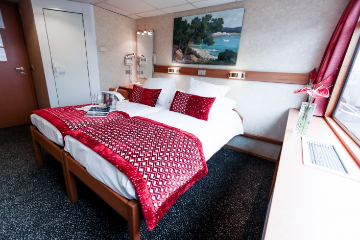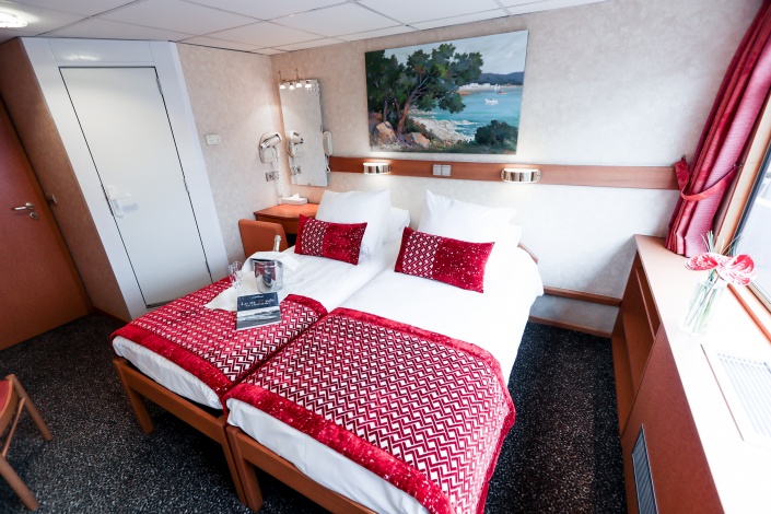 Rummen: Hytterna är ca 10-13 kvm stora och fördelade mellan nedre och övre däck (mot tillägg) men alla är belägna ovanför vattenlinjen. De är utrustade med en dubbelsäng (grand-lit bäddar förekommer) eller två golvstående enkelbäddar samt ett litet badrum med dusch och wc samt TV, interntelefon, Wi-Fi, hårfön, värdebox, luftkonditionering och fönster. Fönstren i hytterna på övre däck är något större och har en liten öppningsbar luftningslucka.